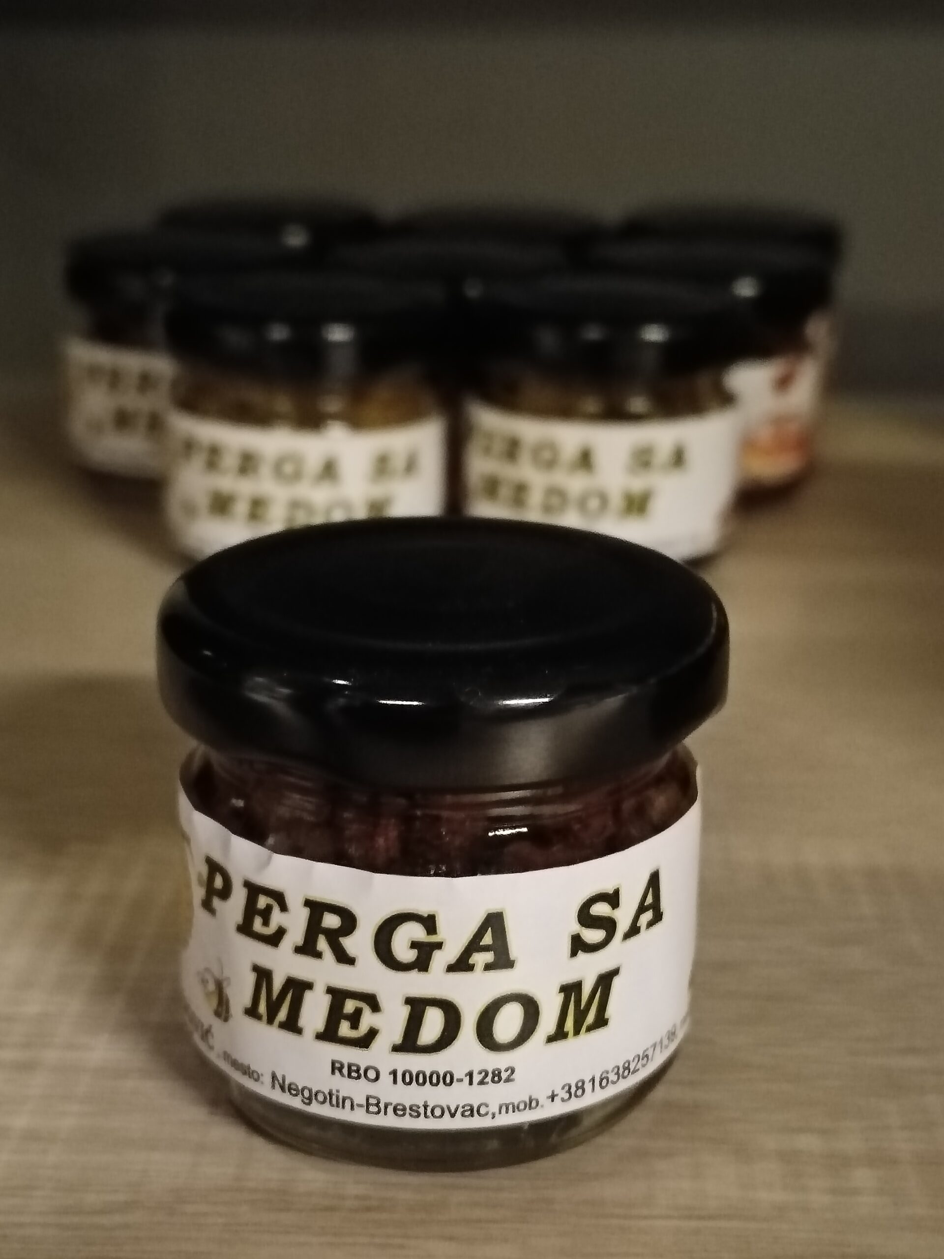 Perga, poznata i kao pčelinji hleb, je još jedan dragoceni proizvod koji pčele prikupljaju i koriste za ishranu u koloniji. To je kombinacija nektara i polena koji pčele fermentišu u saću uz pomoć svojih enzima. Tokom ovog procesa, polen se fermentiše i preobražava u hranjivi materijal bogat vitaminima, mineralima, aminokiselinama, enzimima i drugim korisnim supstancama.